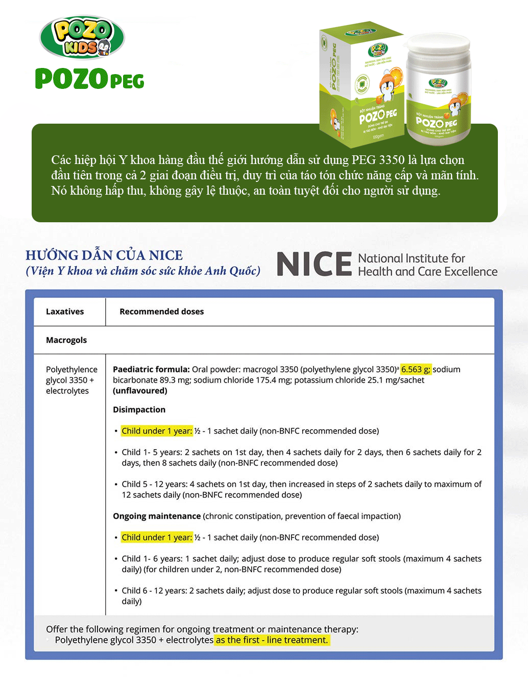 - Thành phần Macrogol 3350 nằm trong LỰA CHỌN ĐẦU TAY khi điều trị táo bón, theo hướng dẫn của Viện Y khoa Anh Quốc NICE