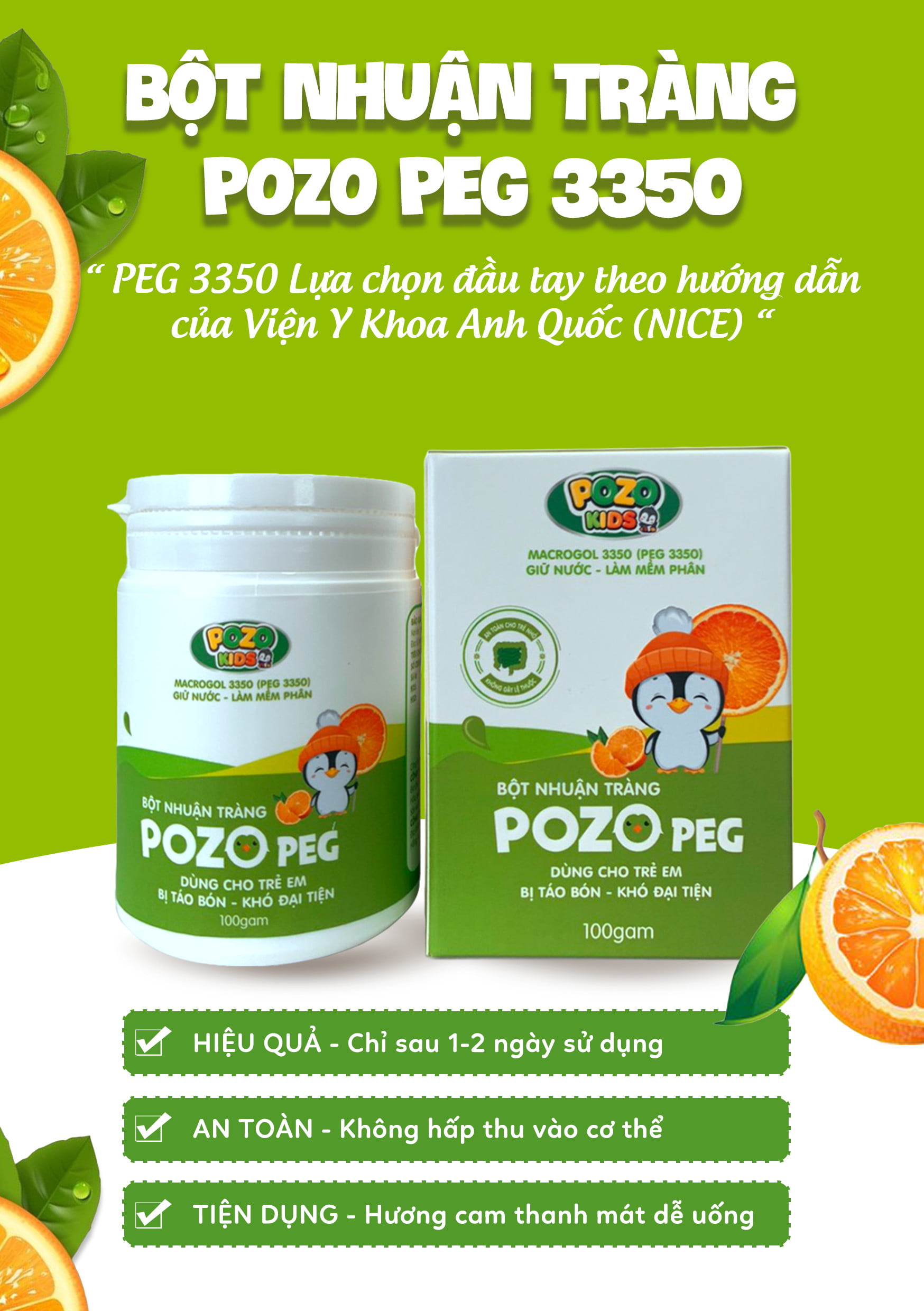 Bột nhuận tràng Pozo PEG 3350 với thành phần chính là Macrogol 3350, hỗ trợ hiệu quả trong điều trị táo bón chức năng ở trẻ. Không giống các sản phẩm trị táo bón thông thường, Bột nhuận tràng Pozo với cơ chế thẩm thấu, làm mềm phân tự nhiên giúp bé đại tiện dễ dàng hơn. Đặc biệt, dùng lâu dài không ảnh hưởn đến hiệu quả và sức khoẻ của bé. Sản phẩm được các bác sĩ, dược sĩ đánh giá cao về chất lượng.